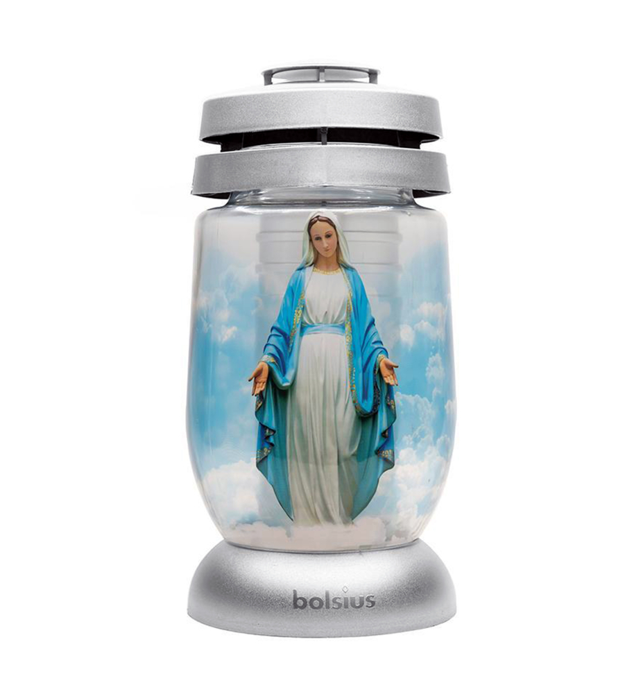 Charakteristika: Kahanec s obrazom Márie v odtieňoch modrej so striebornými akcentmi. Vyrobené z kvalitného priehľadného skla, cez ktoré je krásne vidieť plameň. Vďaka veľkej základni je veľmi stabilný a vďaka špeciálnej štruktúre a "čiapke" je vložka vo vnútri dokonale chránená proti vetru a vode. Elegantný a moderný, vyzerá skvele ako hlavná dekorácia náhrobných kameňov. Kahanec obsahuje náplň s dobou horenia 36 hod.