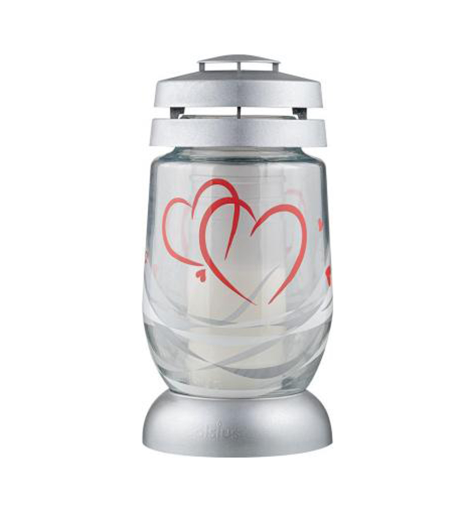 Charakteristika: Kahanec so striebornými akcentmi je vyrobený z kvalitného priehľadného skla, cez ktoré je krásne vidieť plameň. Vďaka veľkej základni je veľmi stabilný a vďaka špeciálnej štruktúre a "čiapke" je vložka vo vnútri dokonale chránená proti vetru a vode. Elegantný a moderný, vyzerá skvele ako hlavná dekorácia náhrobných kameňov. Kahanec obsahuje náplň s dobou horenia 36 hod.