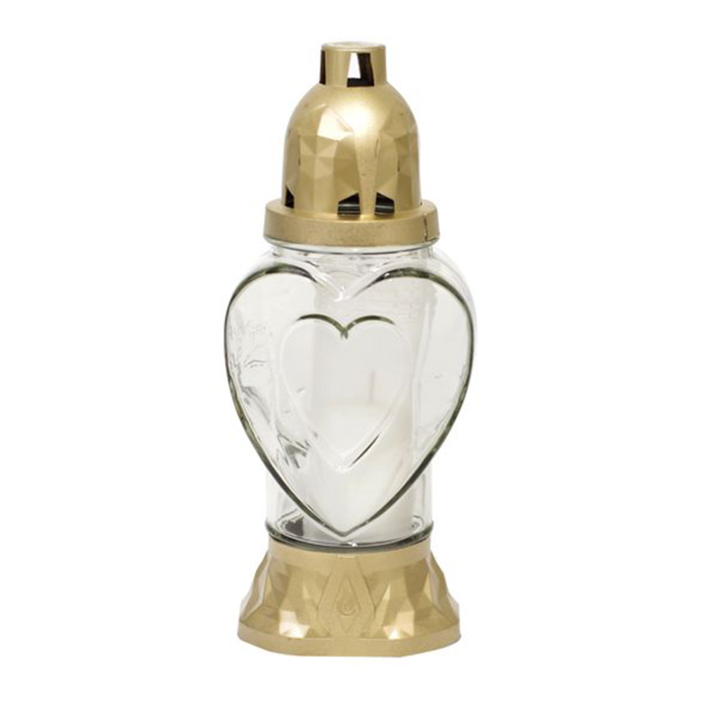 Charakteristika: Kahanec Heart s výškou 25,5 cm a trvaním horenia približne 28 hodín je krásnym doplnkom každého hrobu. Je vyrobený z číreho skla s dekoratívnym srdcovým motívom. Vďaka stabilnému plastovému podstavcu a zlatému viečku je vhodný na celoročné používanie v exteriéri. Jeho jemné línie a elegantný tvar vytvárajú dôstojnú a pokojne pôsobiacu dekoráciu na cintorínoch.