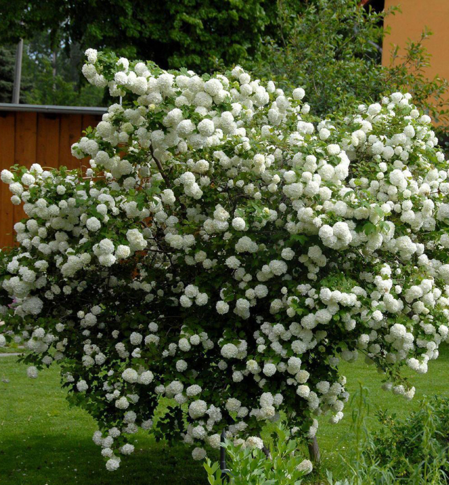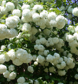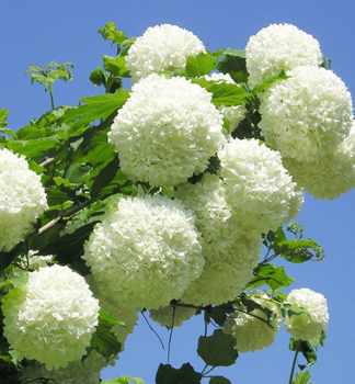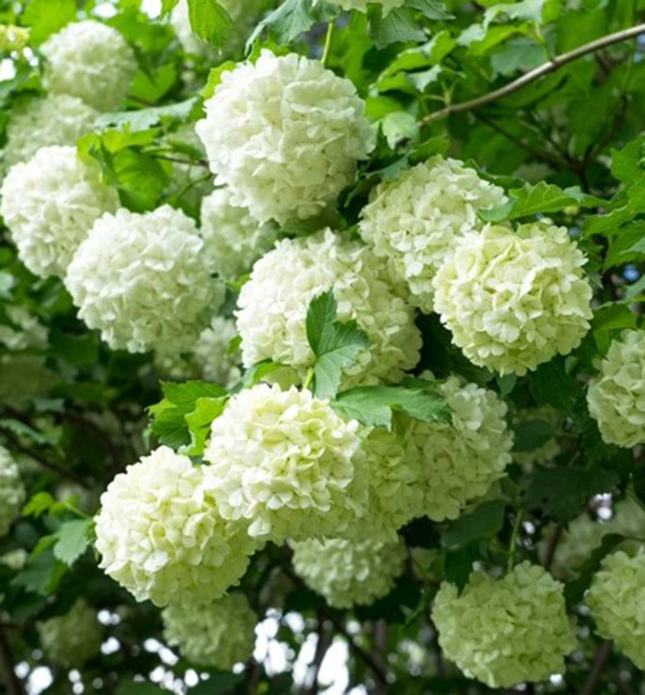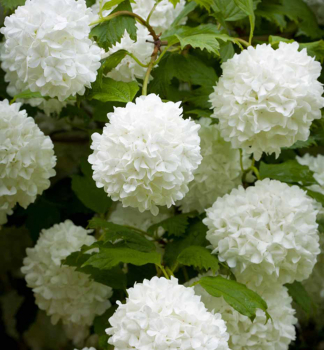 Pôsobivá kalinolistá hortenzia s bielymi guľovitými súkvetiami.