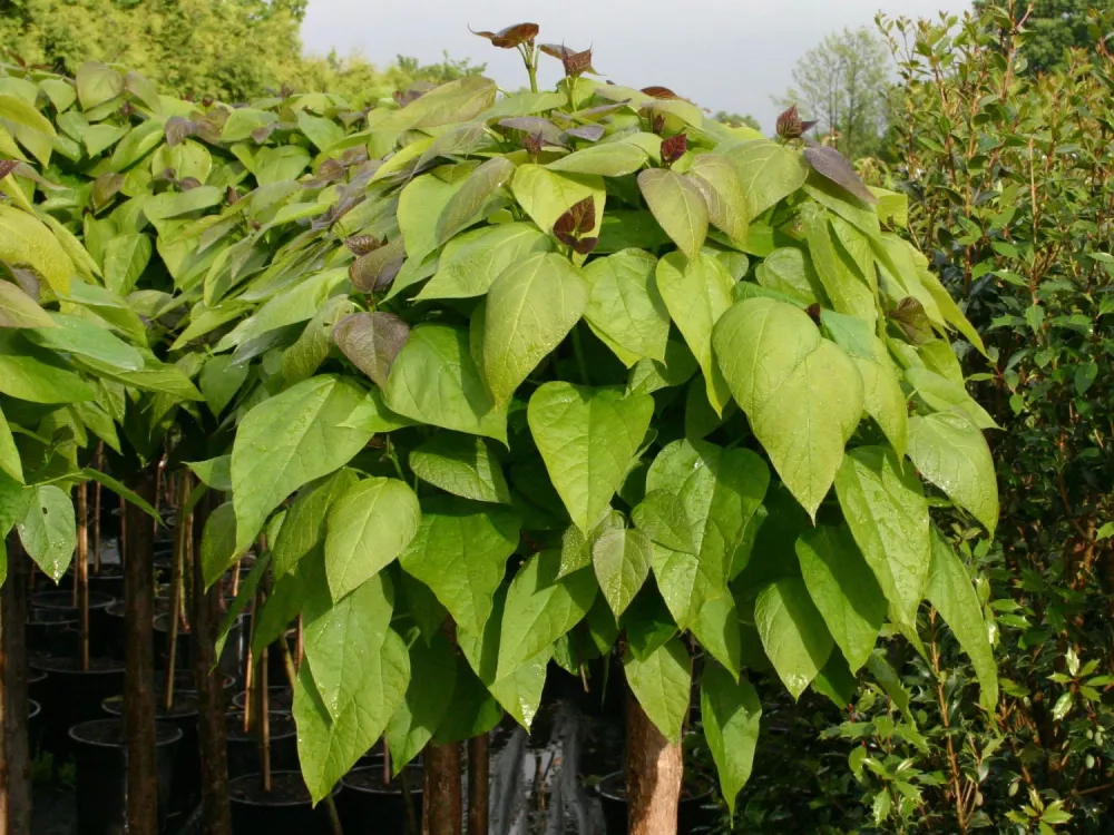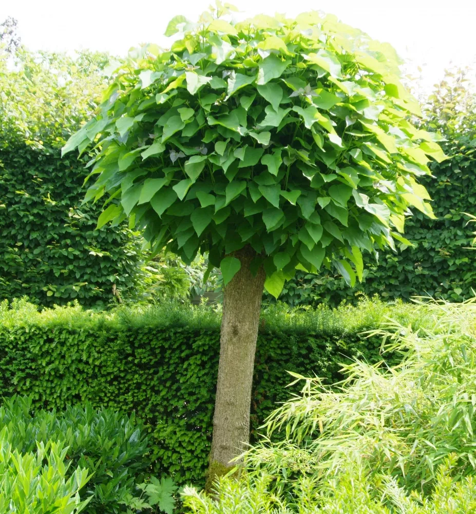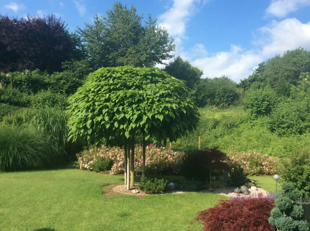 Unikátna zakrslá katalpa s veľkými dekoratívnymi listami a pravidelnou guľovitou korunou.
