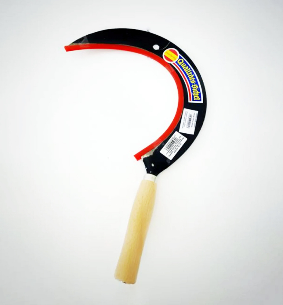 Klasický kosák na vyžíňanie burín s drevenou rukoväťou a oblúkovitou čepeľou.
