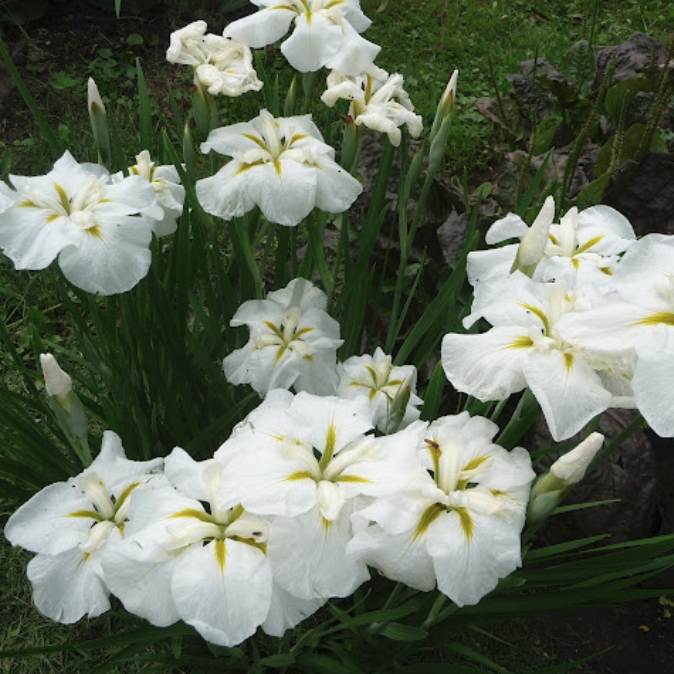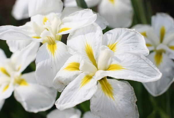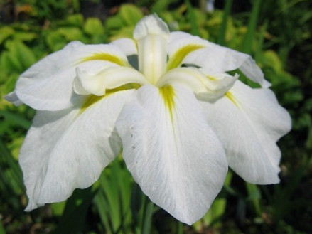 Elegantný japonský kosatec s veľkými bielymi lupeňmi a žiarivožltým stredom.