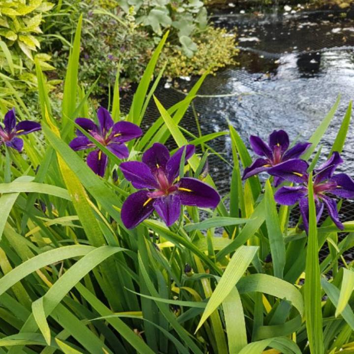 Nádherná bahenná rastlina so sýtomodrými klasmi kvetov a lesklými zelenými listami.