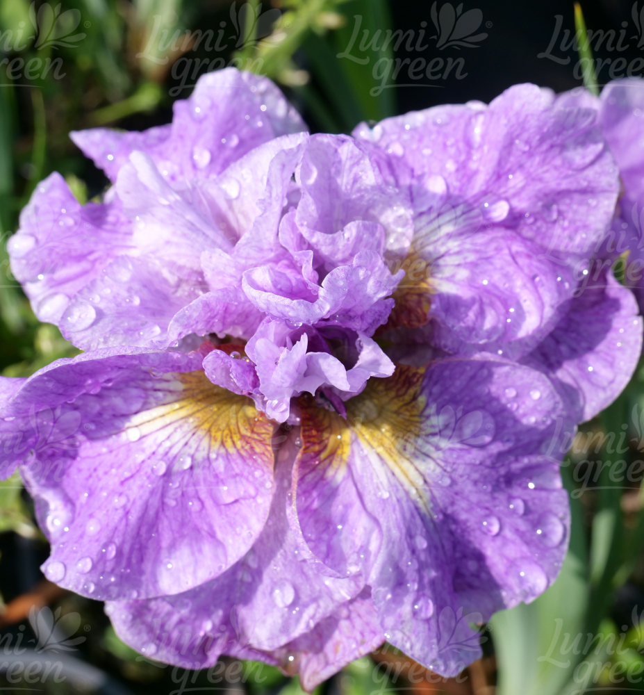 Okúzľujúci plnokvetý kosatec s nariasenými fialovými kvetmi v tvare ruže.
