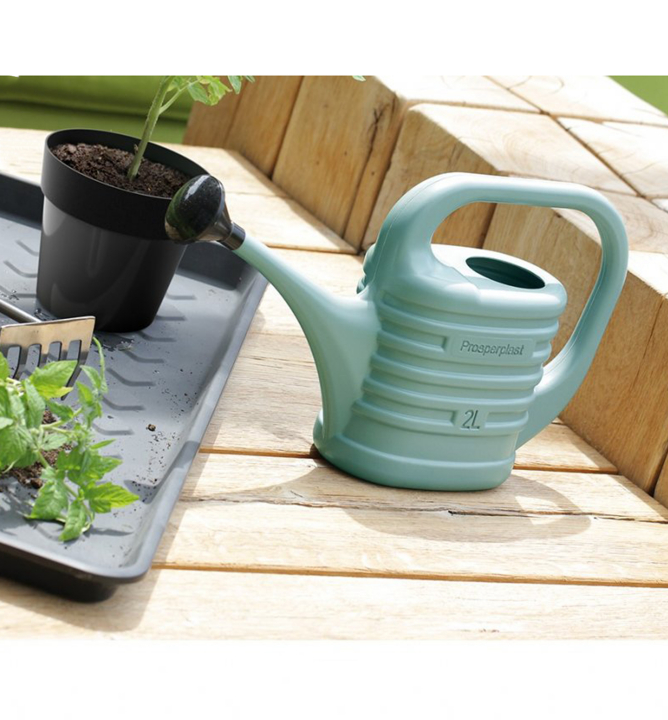 Záhradná plastová krhla s polievacou ružicou určená na polievanie rastlín.