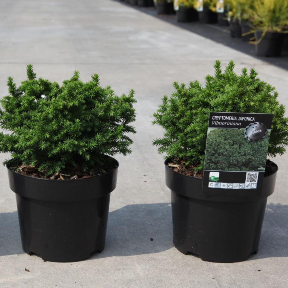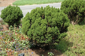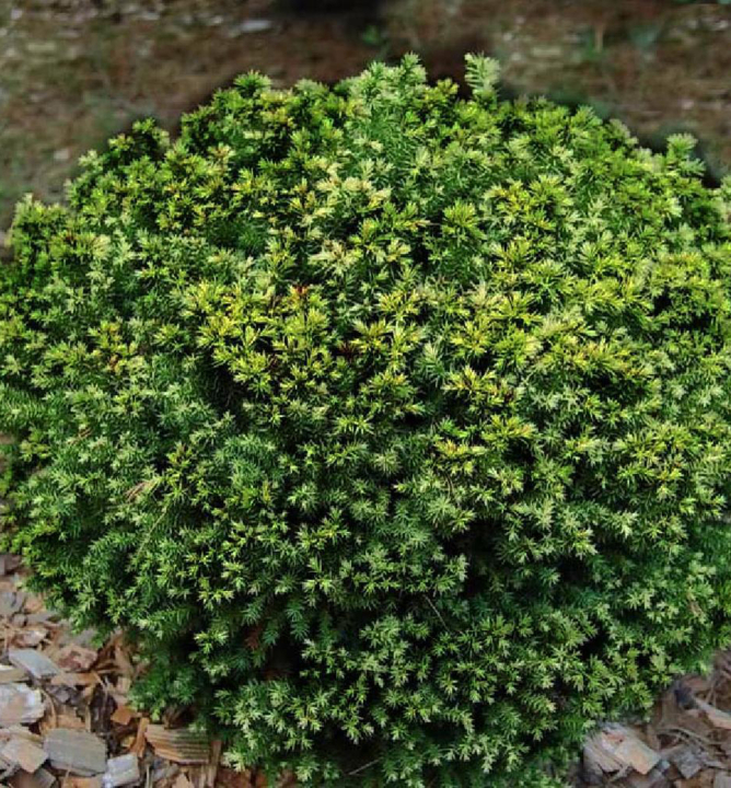 Trpasličia, pomaly rastúca guľovitá borovica s tmavozeleným ihličím.