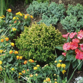 Široko kužeľovitý vysoký smrek s kontrastným dvojfarebným ihličím.