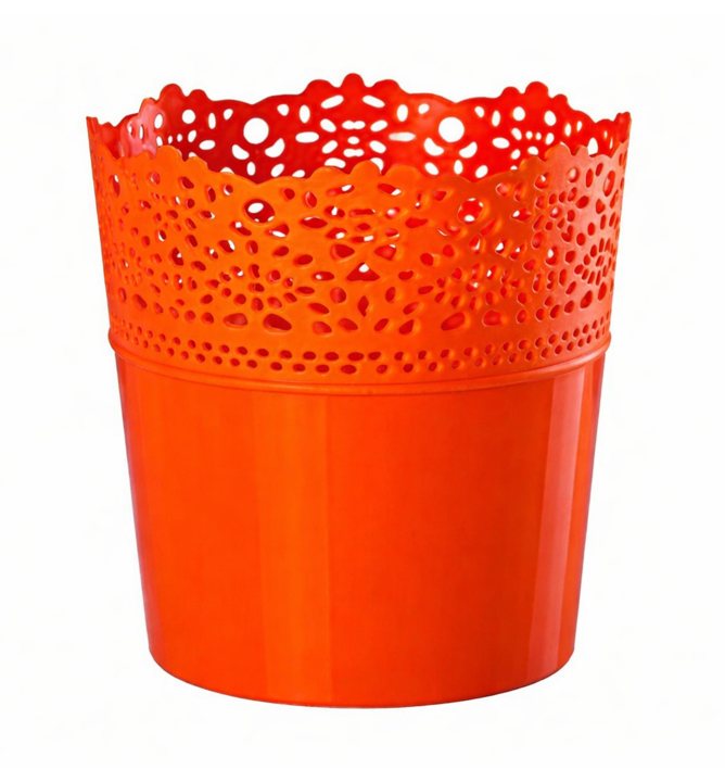 Atraktívny plastový kvetináč s jemným čipkovaným vzorom oranžovej farby.