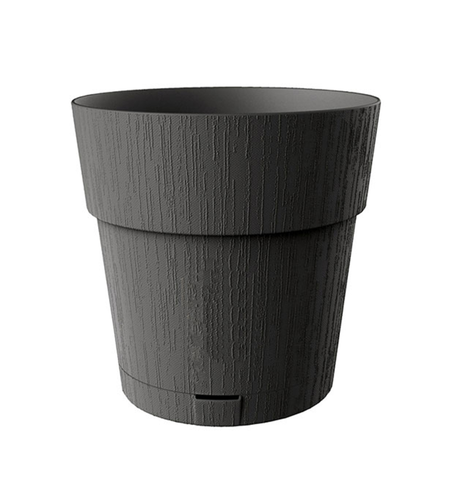 Elegantný plastový kvetináč s podmiskou vybavenou otvorom na zalievanie.