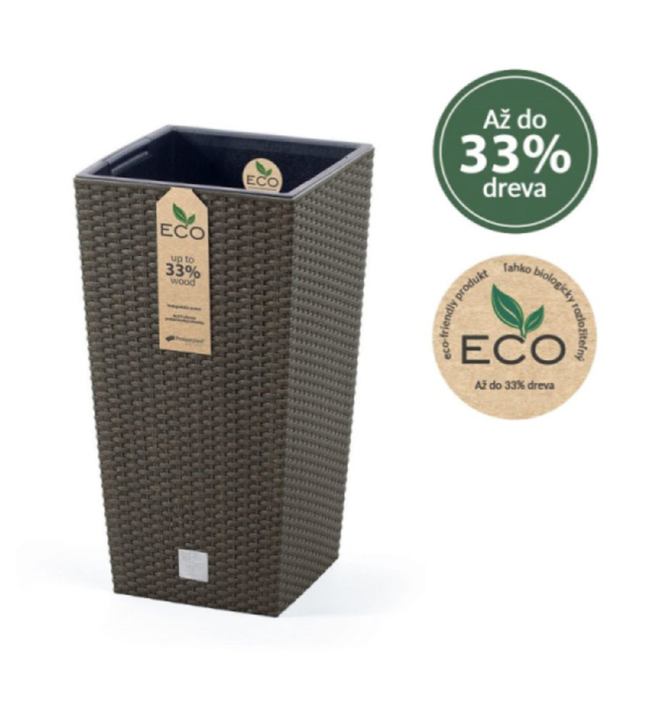 Charakteristika:Kvetináč Rato Square Eco Wood je vyrobený z ekologických materiálov a obsahuje až 33% dreva. Vzor verne imituje prírodný ratanový výplet. Využitie nájde vďaka príjemnej prírodnej kávovej farbe a pevnému materiálu nielen v interiéri, ale aj na balkónoch a terasách v záhrade. Kvetináč obsahuje vložku v 1/3 nádoby na vysadenie rastlín.