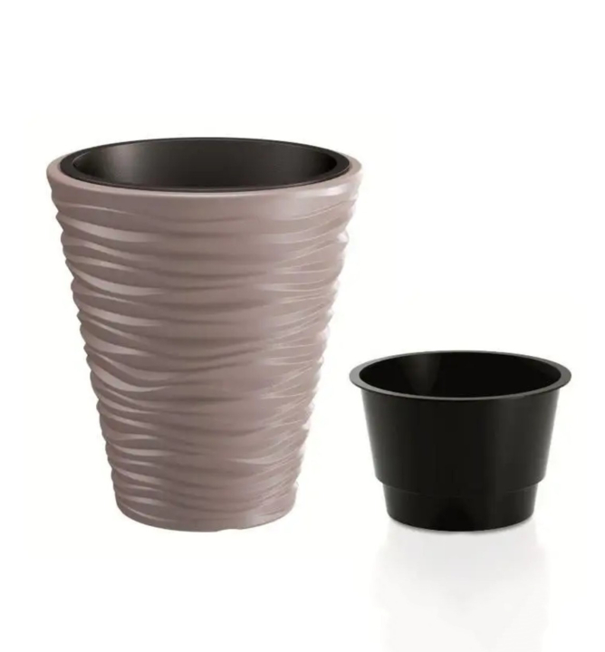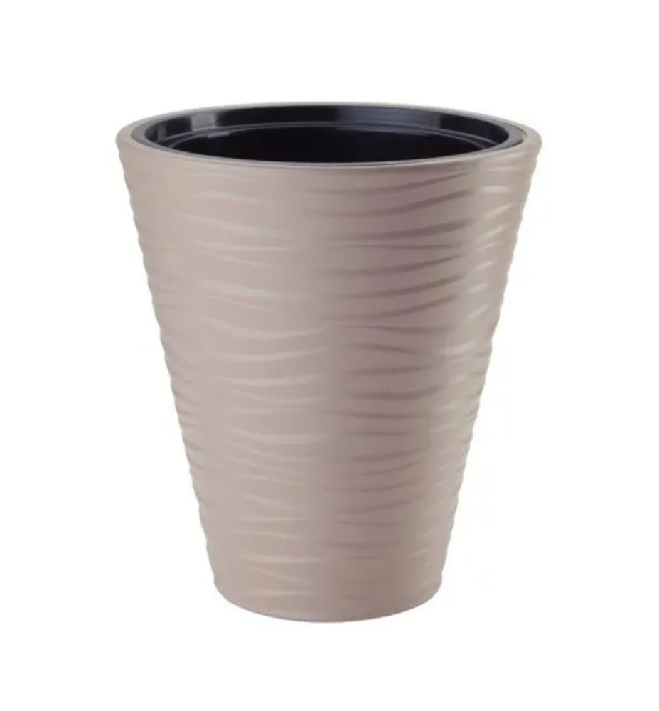 Charakteristika: Kvetináč Sahara s vnútornou vložkou na vysadenie rastlinami je vyrobený z odolného plastu. Je mrazuvzdorný, UV stály a vyznačuje sa vyššou pevnosťou materiálu. Moderný trendový vzhľad vlny je rovnomerne po celom obvode nádoby. Sahara je z matného plastu a vlny sa zvýraznili vysoko lesklým lemom. Je možné ho umiestniť do interiéru aj vonkajších priestorov.