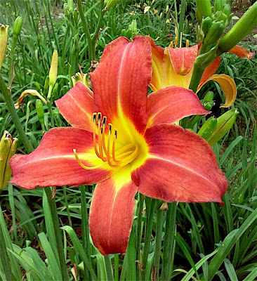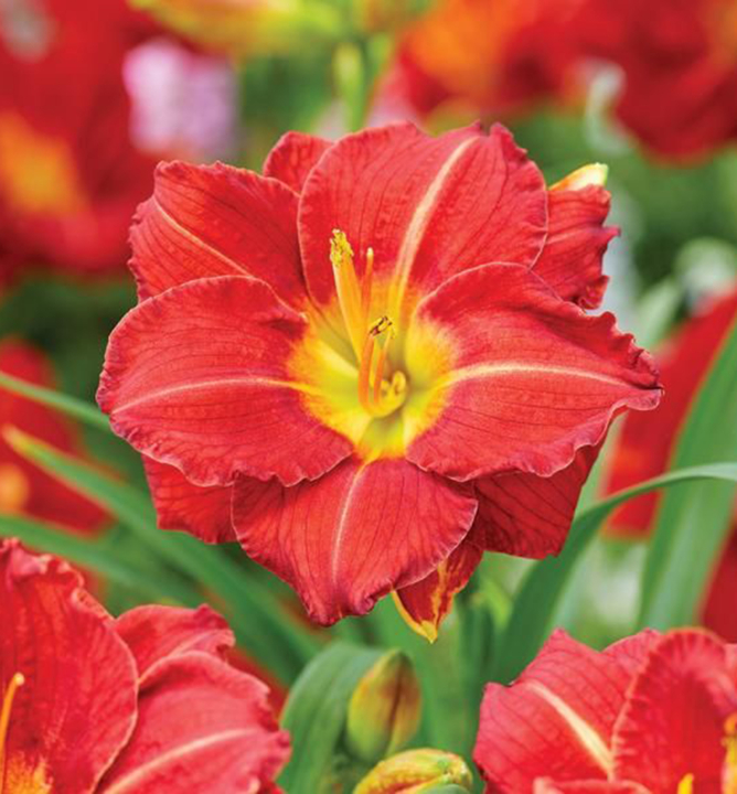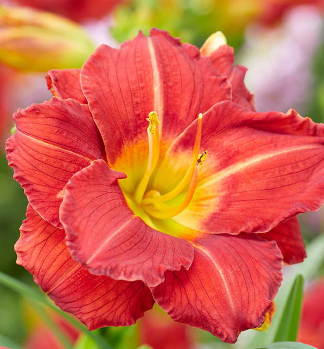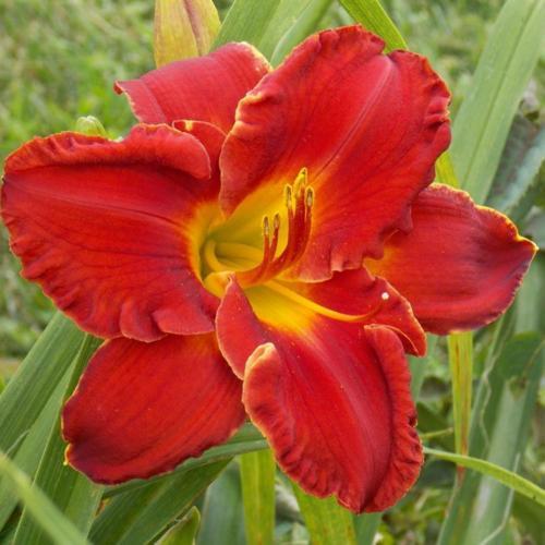 Nový kultivar ľaliovky s neprehliadnuteľnými rubínovočervenými kvetmi a žltým stredom.
