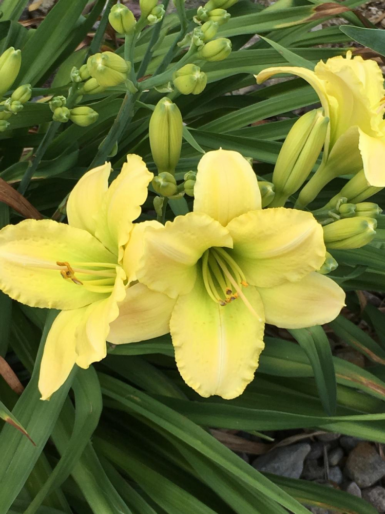 Bohato kvitnúca ľaliovka s veľkými, krémovo bielymi kvetmi so žltým hrdlom.