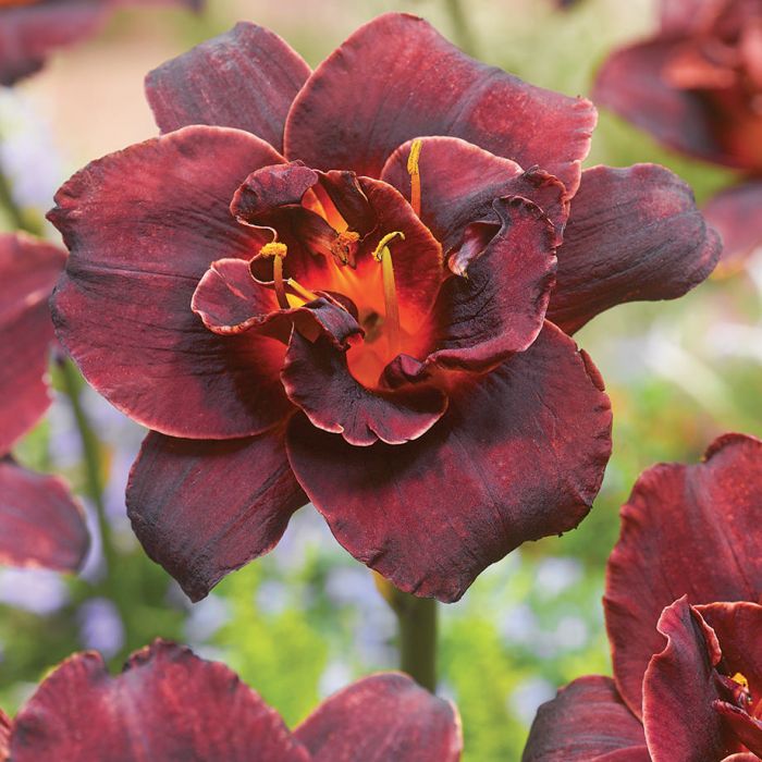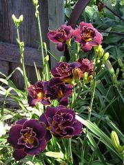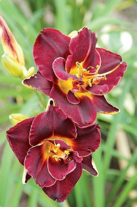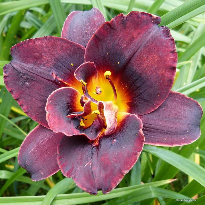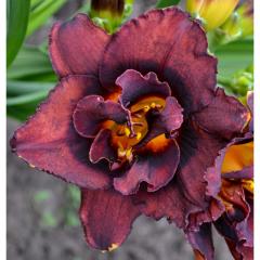 Plnokvetá ľaliovka s bordovými kvetmi a nariasenými okrajmi lemovanými tenkou žltou linkou.