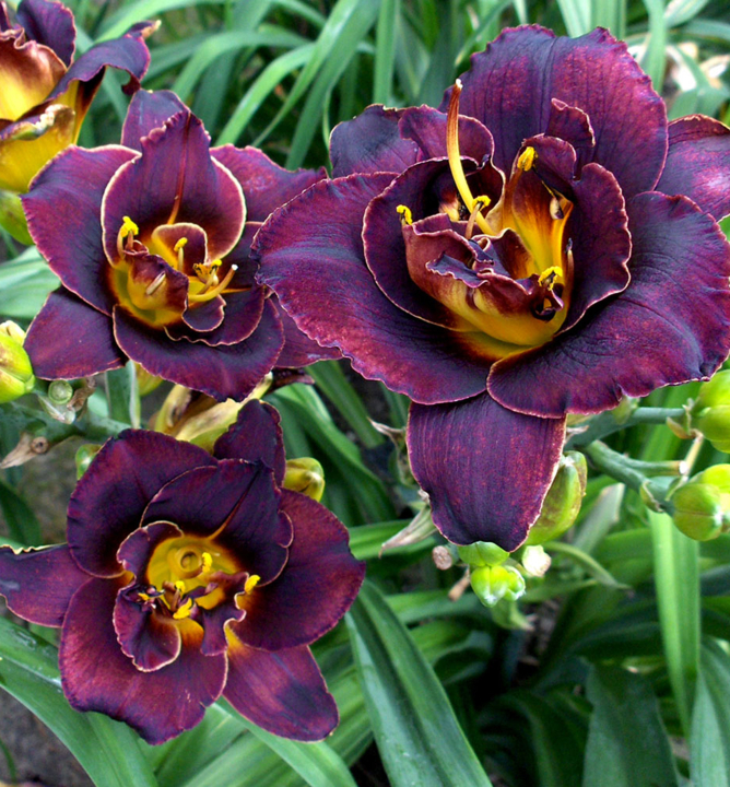 Dlho kvitnúca ľaliovka s plnými kvetmi žiarivej žltej farby.