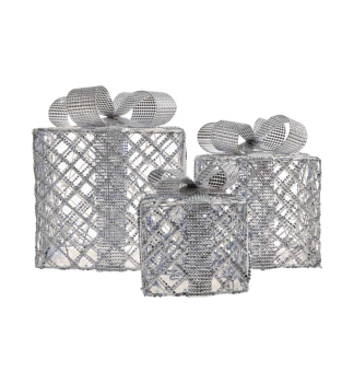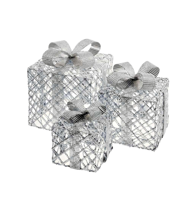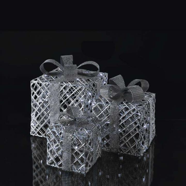 Charakteristika: Svetelná dekorácia- darčeky v troch veľkostiach a v studenej bielej farbe je vhodná na výzdobu interiéru. Táto krásna vianočná dekorácia vyčarí tú správnu sviatočnú atmosféru.