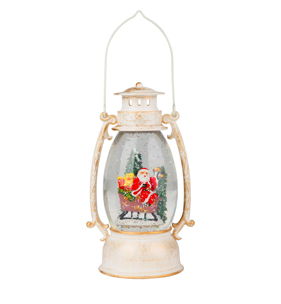 LED dekoračný lampáš so Santom a trblietkami z plastového materiálu.