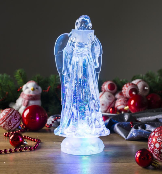 Charakteristika: LED svietiaci anjel z priehľadného plastu, vnútri farebné osvetlenie s poletujúcimi trblietkami. Farba LED je LED meniaca farby a počet LED je 1. Je vhodný na použitie v interiéri.