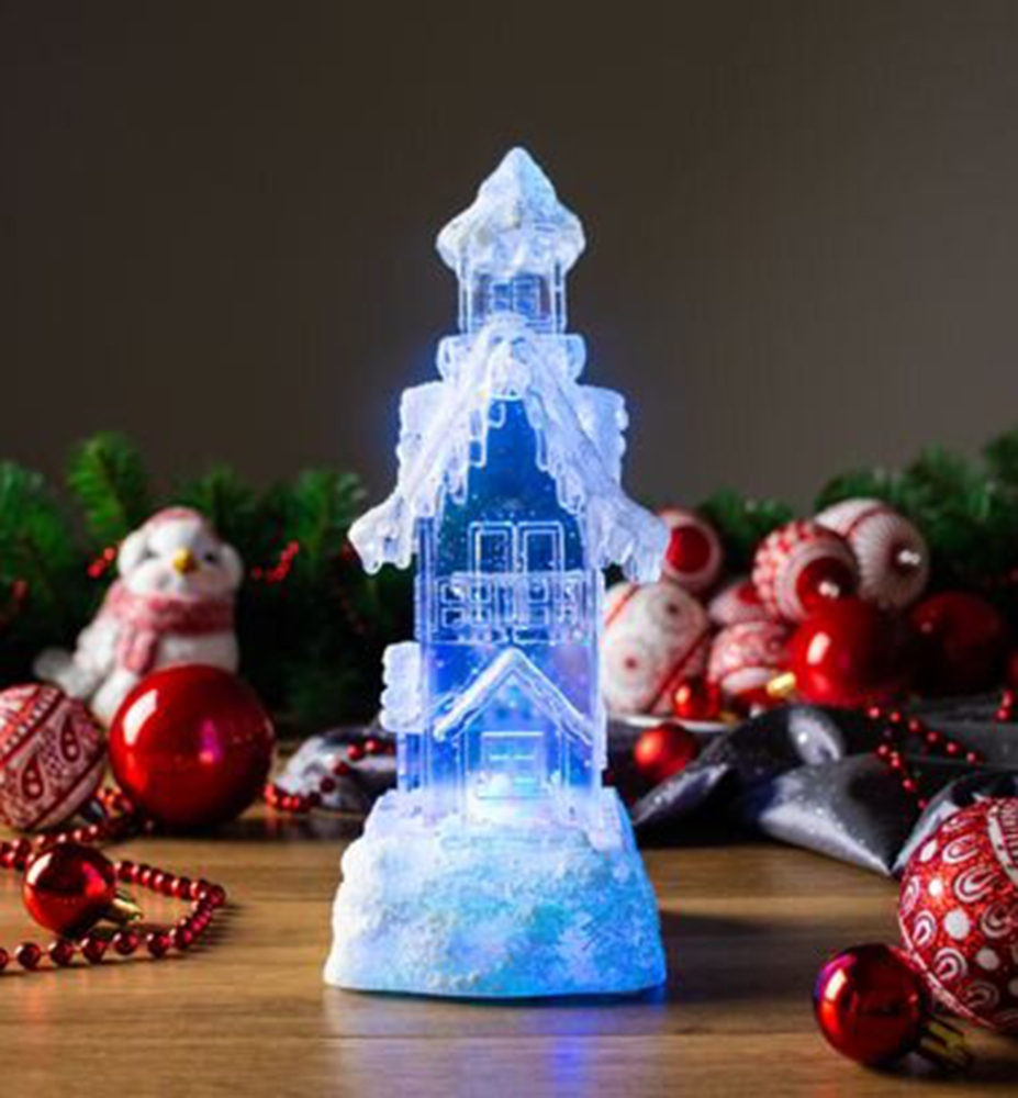 Charakteristika: LED svietiaci domček z priehľadného plastu, vnútri farebné osvetlenie s poletujúcimi trblietkami. Farba LED je LED meniaca farby a počet LED je 6. Je vhodný na použitie v interiéri. Disponuje funkciou jednoduchého svietenia a spínačom ON/OFF.