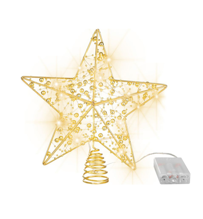 Charakteristika:Dekoratívna vianočná hviezda je krásnym doplnkom na vrchol vášho vianočného stromčeka. Vyrobená z odolného plastu so zlatým povrchom a jemným zdobením, vďaka čomu pôsobí elegantne a štýlovo. Svetelný efekt zabezpečuje 10 LED diód v teplej bielej farbe, ktoré vytvárajú príjemnú sviatočnú atmosféru.