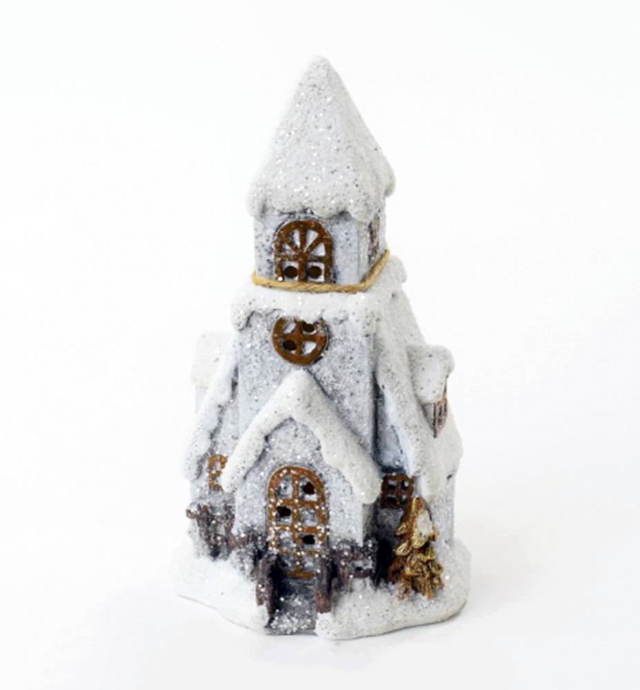 Charakteristika: Keramický kostolík s poriadnou nádielkou trblietajúceho sa snehu na streche. Vhodne doplnený LED svetielkom prináša do interiériu vianočnú zimnú atmosféru.