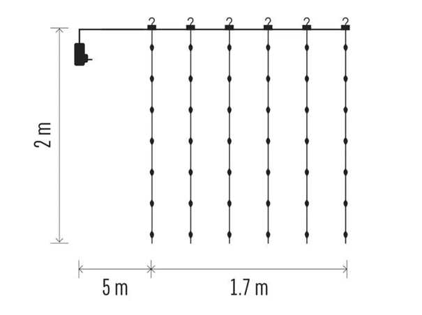 - LED vianočná drop reťaz – záclona, 1,7x2 m, vonkajšia aj vnútorná, teplá biela, programy