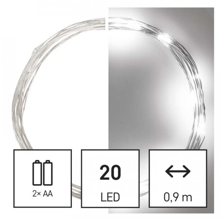 LED vianočná nano reťaz, vnútorná, 20 LED, studená biela, 2xAA, časovač, 1,9 m
