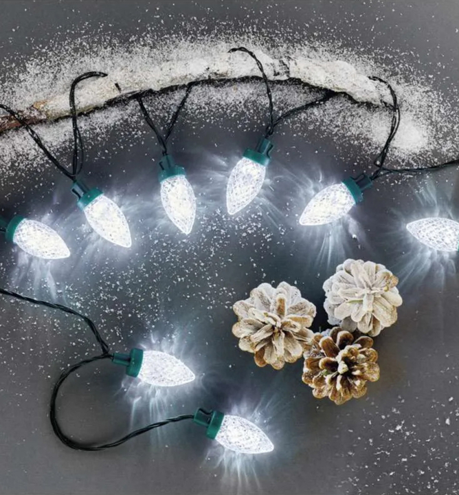 Vianočná LED reťaz žiariaca studeným bielym odtieňom na výzdobu interiéru a exteriéru.