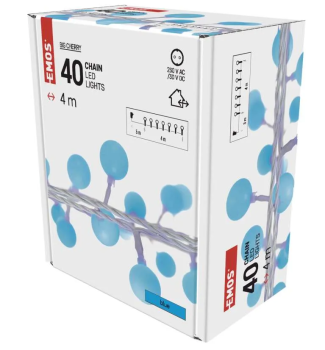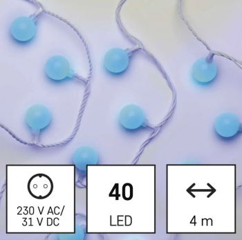 Charakteristika: LED svetelná reťaz so 40 ledkami v tvare guličky, svieti modrou farbou. Dĺžka 4 metre. Vianočné LED svetlá sú vhodné ako pre vnútorné, tak aj vonkajšie použitie.