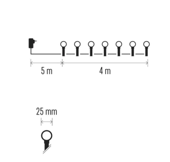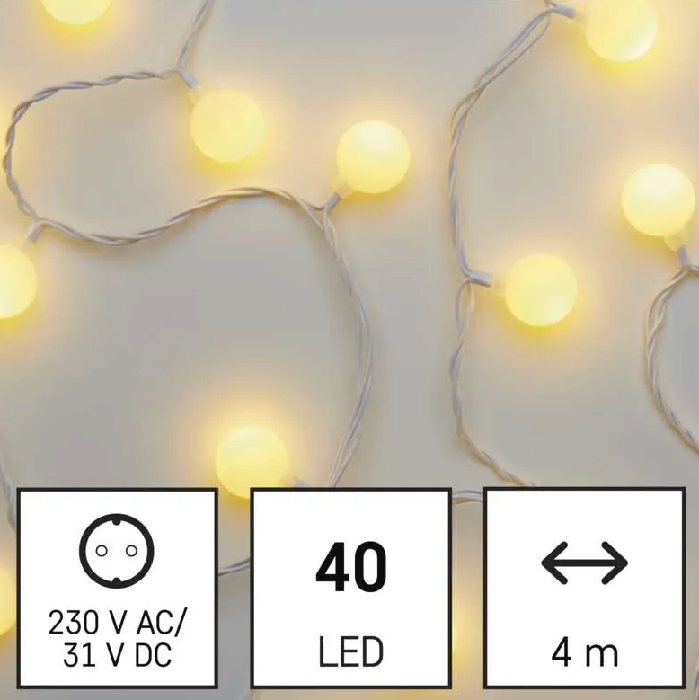 Charakteristika: LED svetelná reťaz so 40 ledkami v tvare guličky, svieti teplou bielou farbou. Dĺžka 4 metre. Vianočné LED svetlá sú vhodné ako pre vnútorné, tak aj vonkajšie použitie.