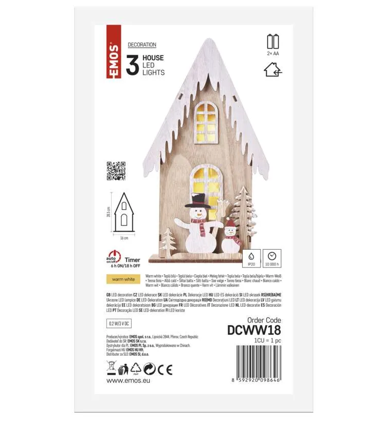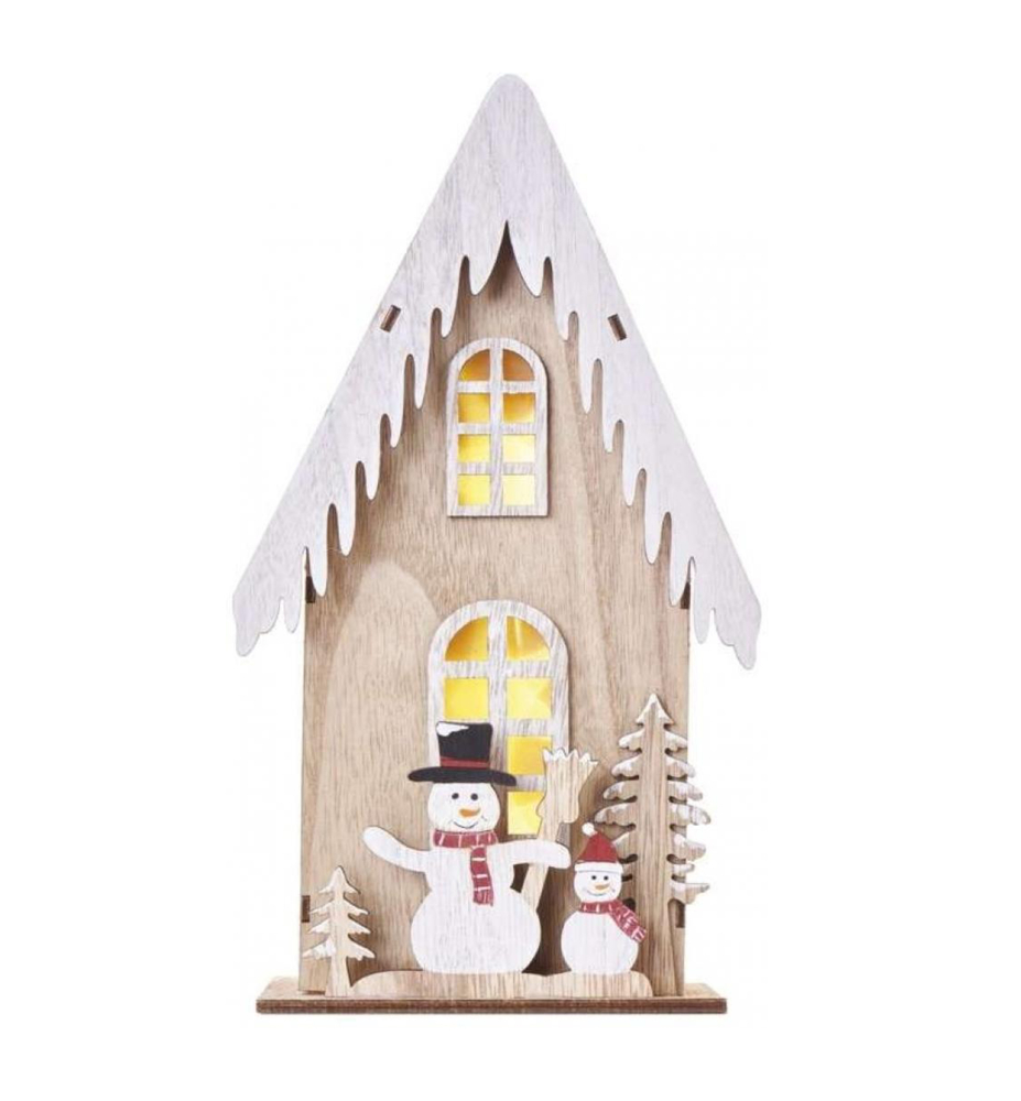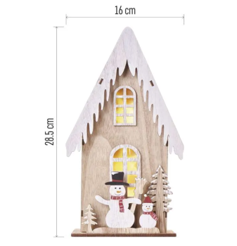 Charakteristika: Vianočná LED dekorácia zasneženého dreveného domčeka so snehuliakmi sa skvele hodí na chodbu aj do obývačky. Dekorácia je vhodná na použitie v interiéri.