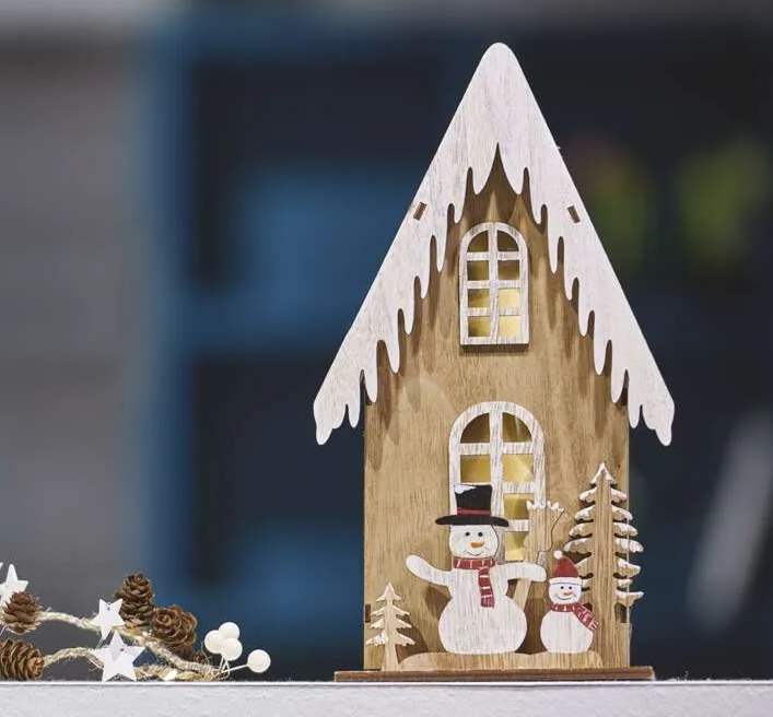 Krásne prepracovaný drevený domček so snehuliakmi na použitie v interiéri.