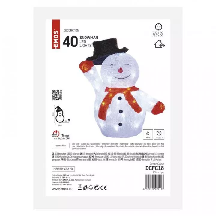 Charakteristika: LED vianočný snehuliak slúži na skrášlenie domácnosti počas zimy a vianočných sviatkov. Je vhodný do vonkajších aj vnútorných priestorov. Snehuliak s výškou 36 cm a 40 LED svetlami rozžiari váš domov.