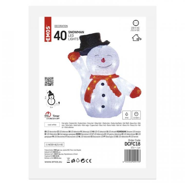 LED vianočný SNEHULIAK, 40 LED, vonkajší, studená biela, časovač, 36 cm