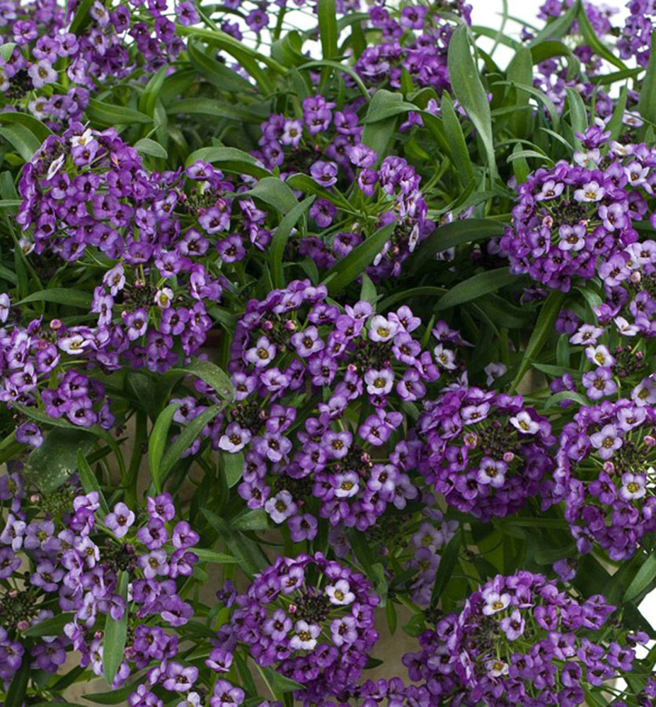 Bohato kvitnúca lobulária s množstvom aromatických levanduľových súkvetí.
