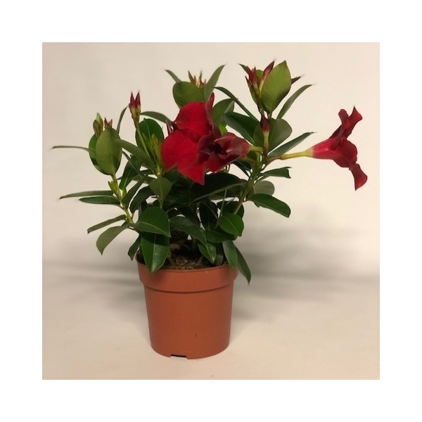 Charakteristika: Kultivar ´JADE RED´ neúnavne kvitne od leta do neskorej jesene červenými kvetmi so žltým stredom, ktoré dodávajú jasný, exotický vzhľad. Tmavo zelené a veľmi leslé listy vytvárajú s kvetmi zaujímavý kontrast. Rastlina tvorí hustý, dobre stavaný trs. Mandevilla známa aj pod názvom dipladénia, je obľúbená popínavá liana, ktorá pôsobí neprehliadnuteľne počas celej sezóny. Pestujeme ju na balkónoch, terasách alebo v črepníkoch. Má previsnutý rast alebo sa može ťahať po opore.