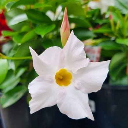 Charakteristika: Kultivar ´JADE WHITE´ očarí svojimi snehovobielymi kvetmi a žltým stredom. Tmavo zelené a veľmi leslé listy vytvárajú s kvetmi zaujímavý kontrast. Rastlina tvorí hustý, dobre stavaný trs. Mandevilla známa aj pod názvom dipladénia, je obľúbená popínavá liana, ktorá pôsobí neprehliadnuteľne počas celej sezóny. Séria JADE bola vyšľachtená vo Francúzsku. Pestujeme ju na balkónoch, terasách alebo v črepníkoch.