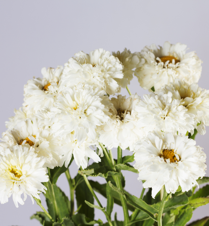 Očarujúca margaréta nižšieho vzrastu s bielymi strapatými kvetmi.