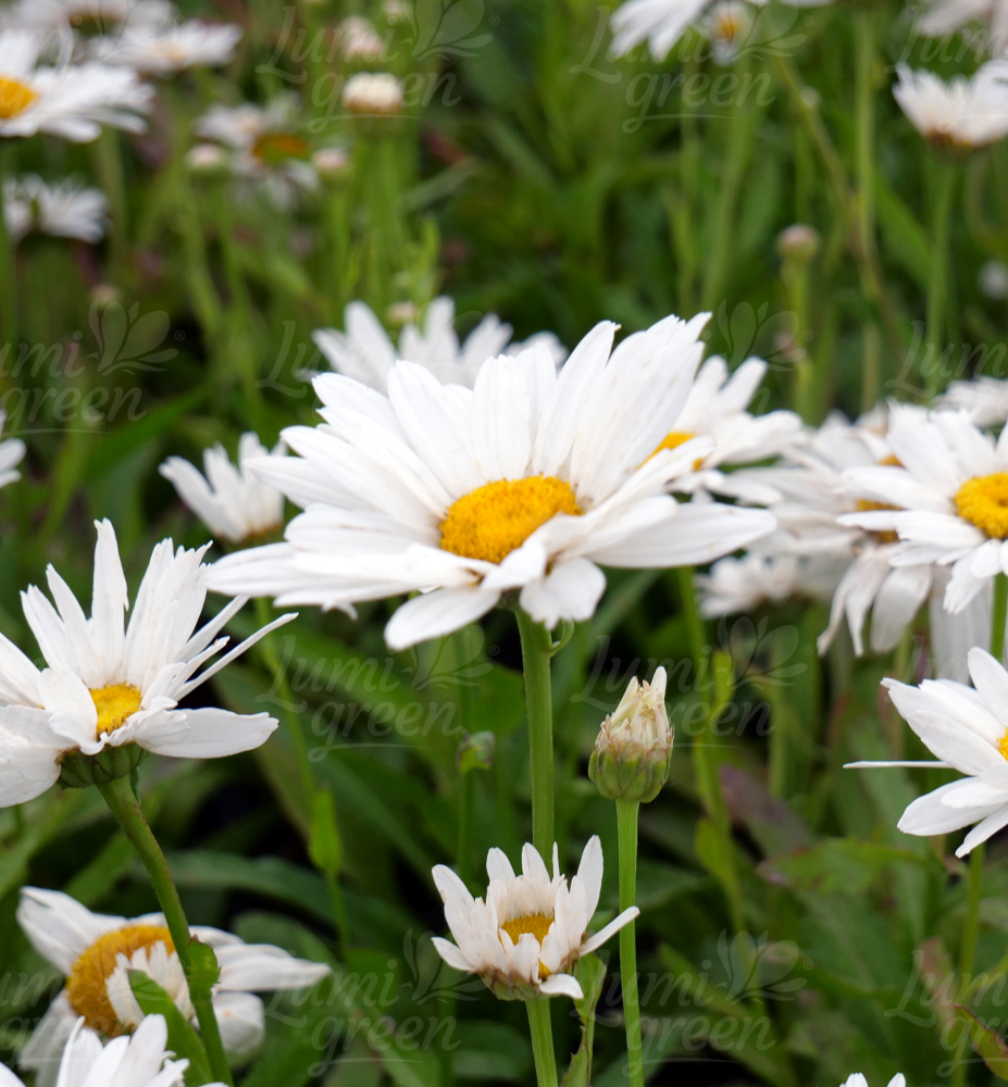 Nižšia kompaktná margaréta s veľlými snehovobielymi kvetmi so žltým stredom.