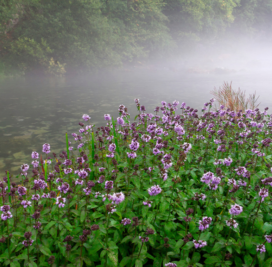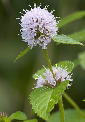 Zaujímavá vodná mäta so sviežimi zelenými listami a fialovými kvetmi.