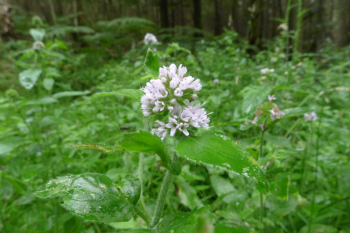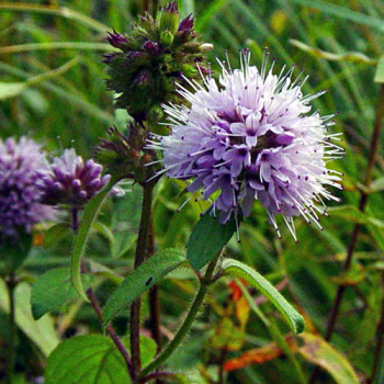 Zaujímavá vodná mäta so sviežimi zelenými listami a fialovými kvetmi.
