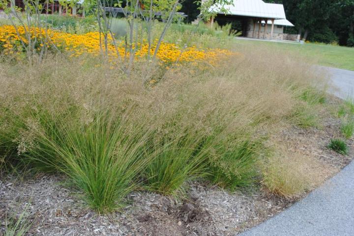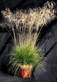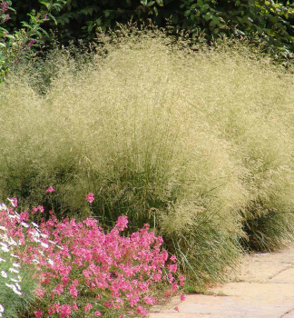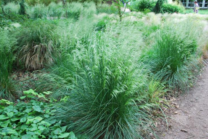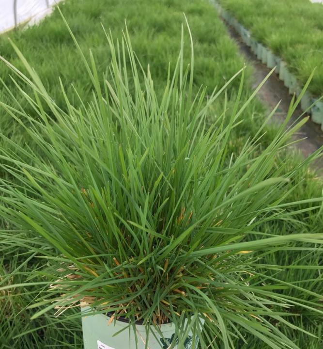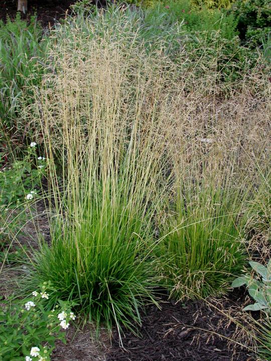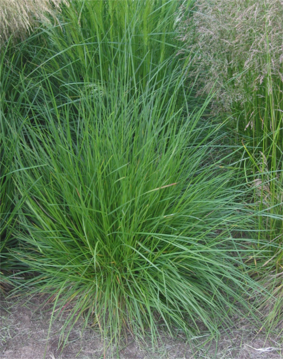 Atraktívna odroda stálezelenej trávy s dlhými zelenými listami a zlatohnedými metlinami.