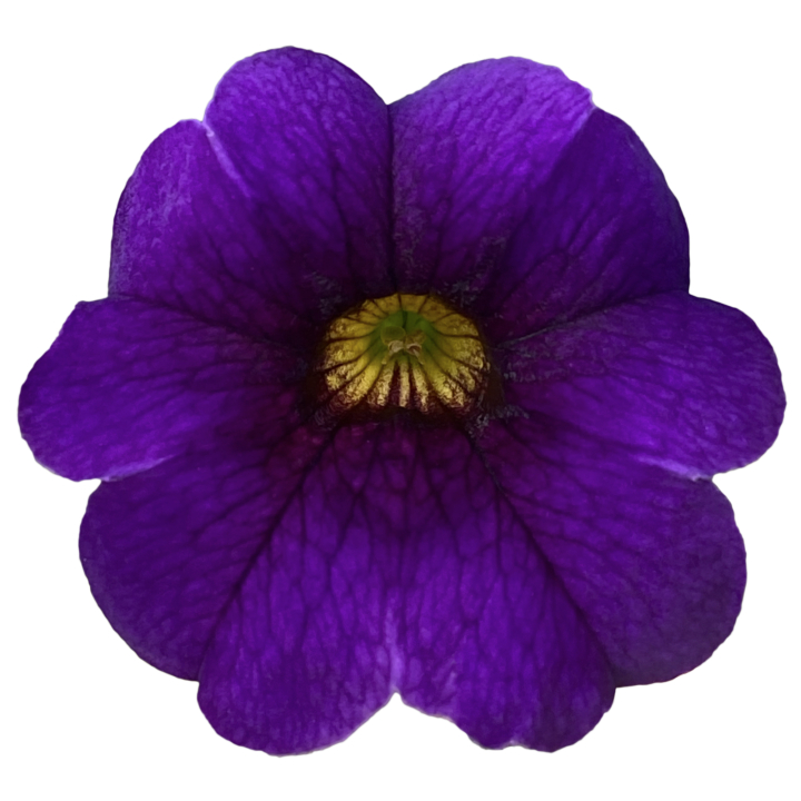 Atraktívna bohato kvitnúca minipetúnia s fialovými kvetmi a žltým stredom.