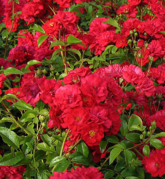 Neprehliadnuteľná ruža s poloplnými intenzívne červenými kvetmi atraktívnymi pre včely.