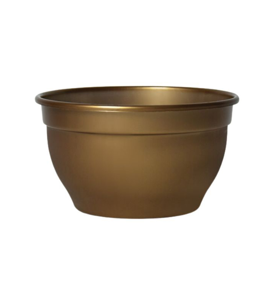 Plastová misa v zlatej farbe vhodná na celoročné vonkajšie použitie.
