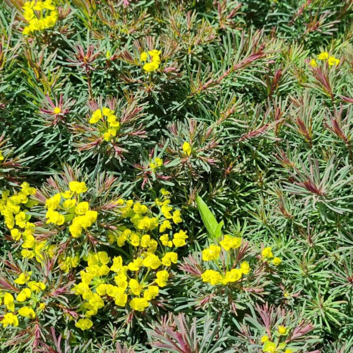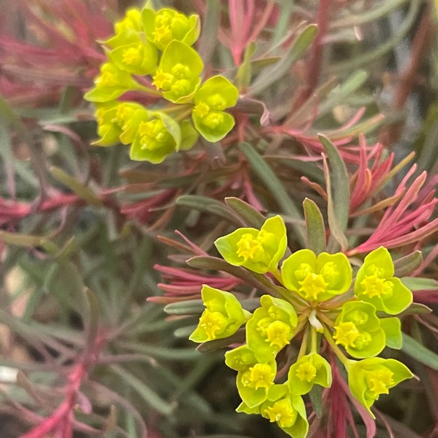 Nezvyčajný mliečnik s ihlicovitými listami a atraktívnym jarným červeným sfarbením.