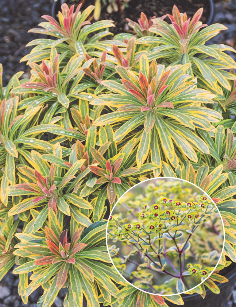 Charakteristika: Mliečnik ´ASCOT RAINBOW´ je krásna trvalka, tvoriaca hustý kompaktný guľovitý trs s výnimočným zafarbením po celý rok. Listy sú úzke a pestrofarebné, rastú do úhľadne vrstvenej ružice. Majú modro-zelenú farbu s krémovo-žltým lemovaním. Tento lem je na nových listoch na jar červenej farby a počas jesene sa opäť mení z krémovo-žltej na červenú. Od júla do novembra kvitne zaujímavými žltými kvetmi.