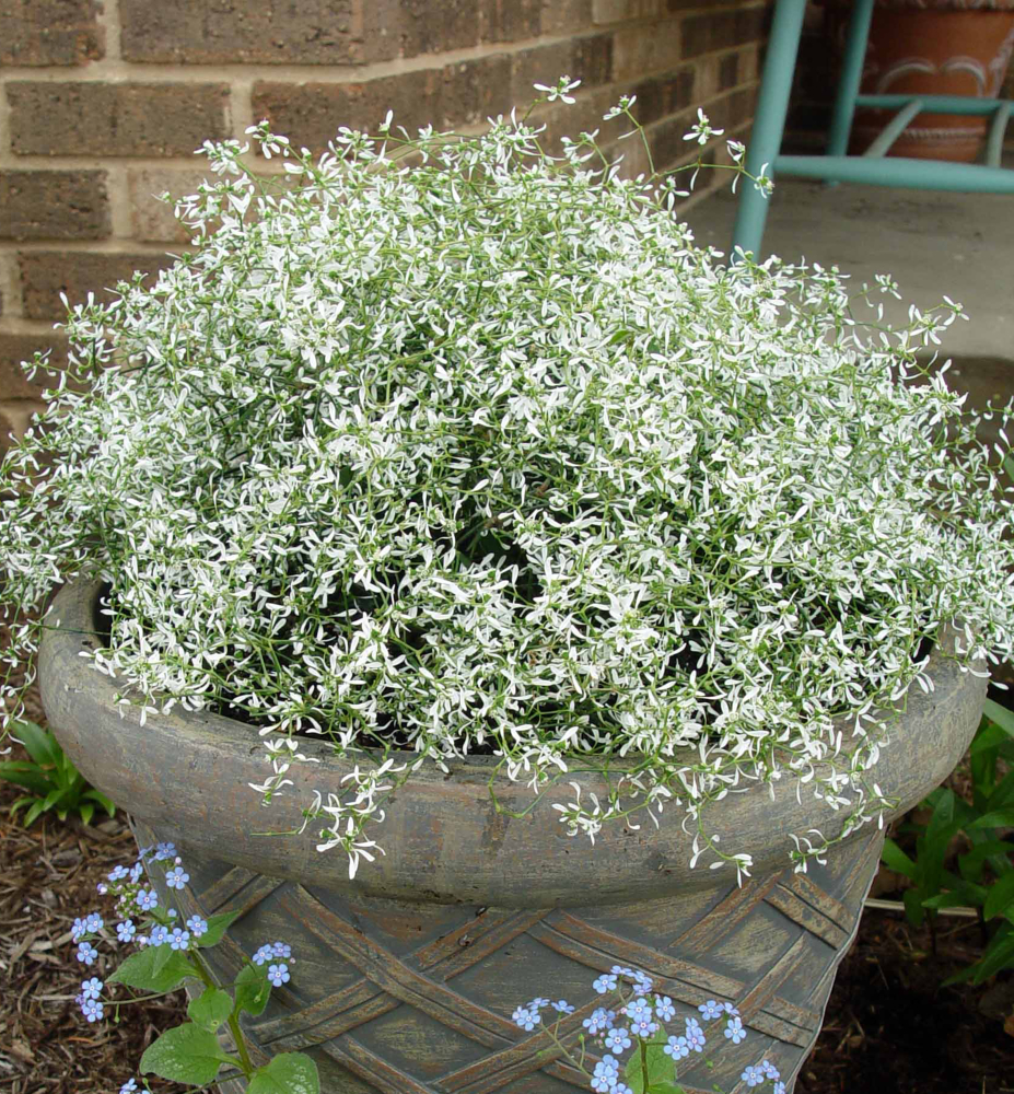 Exotická rastlina nazývaná "Snehová fujavica" tvoriacia jemné previsy bielych kvetov.