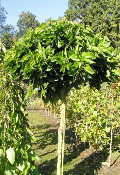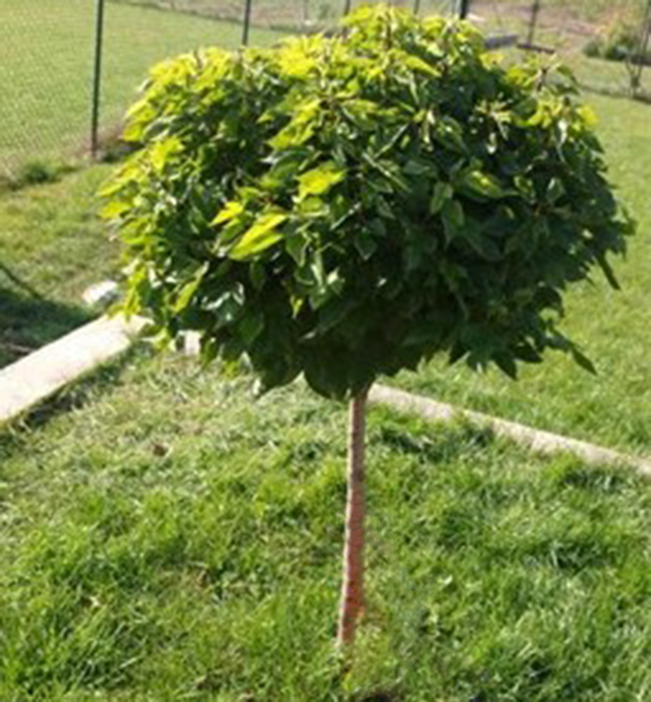 Unikátna zakrslá katalpa s veľkými dekoratívnymi listami a pravidelnou guľovitou korunou.